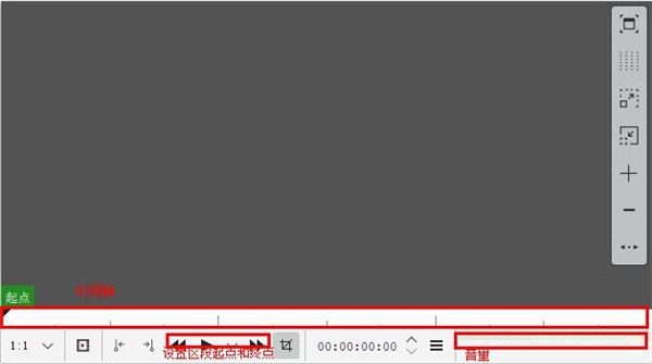 被框出的两个按钮用于设置预览窗口时间轴上预览区段的起点和终点,“播放”按钮右部的小箭头下拉框中可以选择“播放区段”