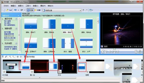 6、根据视频需要,为每段视频或者图片逐渐添加合适的转场。