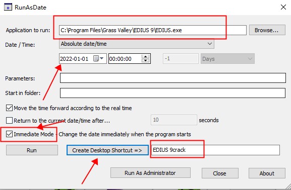 8、并且以管理员身份运行,首先选择安装目录文件EDIUS.exe,可随意设置到期时间,勾选”immediate mode -change”,最后点击Create Desktop Shortcut;