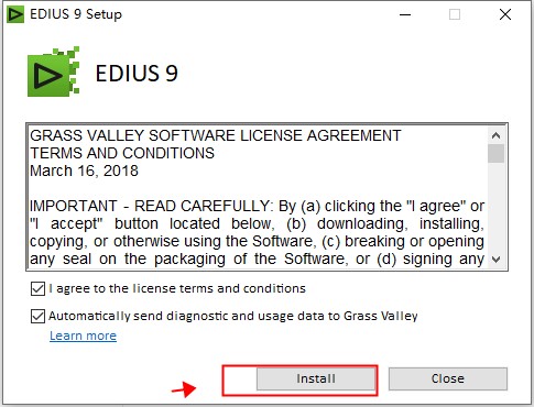 2、首先双击运行"EDIUS_Setup-9.20.3340.exe"程序,勾选软件协议,点击Install进行安装;