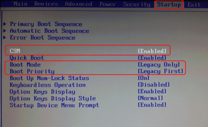 进入“Startup”,将“CSM”(兼容支持模块)设置成“Enabled”,将“Boot Mode”设置成“Legacy Only”,将“Boot Priority”设置成“Legacy First”。