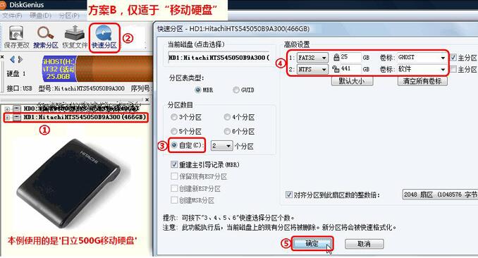 ⑤点击“确定”以后按提示操作即可,程序将自动执行分区、格式化、分配盘符等工作,完成后请关闭DiskGenius,拔掉移动硬盘。