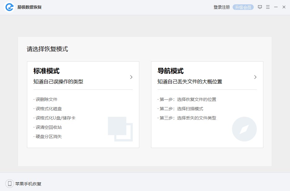 1、打开软件后,会有两种找回数据的导航模式,选择其中一种模式;