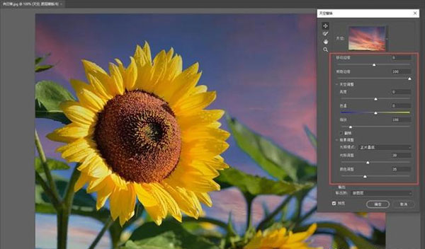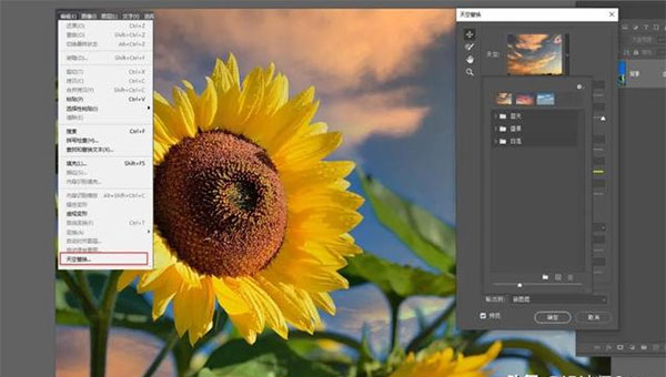 首先调入一张照片(带有天空场景),点击“编辑→天空替换”,稍后PS会打开一个小面板。这里最顶端是几组预置天空,分成蓝天、盛景和日落三大类。