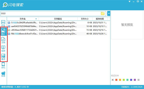 2、若用户还想要更加细致化的操作,可点击左侧的“图片”、“文档”、“视频”、“音频”等按钮,进行更加精确化的查找。