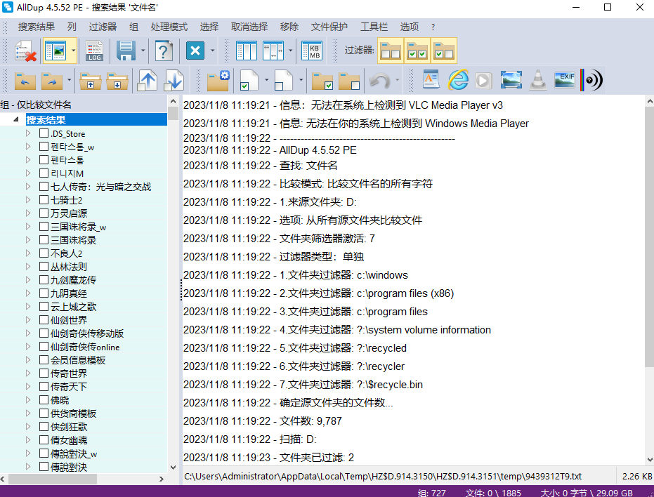 AllDup是一款小巧而又强大的重复文件删除工具,高效简洁。很多人遇到了这样的问题,有时候需要修改文件,就先复制一份。多次修改后,备份越来越多。但有位于不同的位置。删除它们很繁琐。但想着有很占用空间。AllDup凭借优秀的算法让它能快速定位重复文件。当然这不限于文件名,包括文本文件的内容。还有图片、音乐及视频也是包含的。可谓是全能的。重复文件不仅无用而且占用系统空间,有的甚至无法发现。界面十分的简洁,常用功能都在工具栏上。操作方面也特别人性化。很多细节上的设计也很完美。所以,AllDup重复文件删除工具绝对是,彻底摆脱繁杂,一键删除所有重复文件的利器。