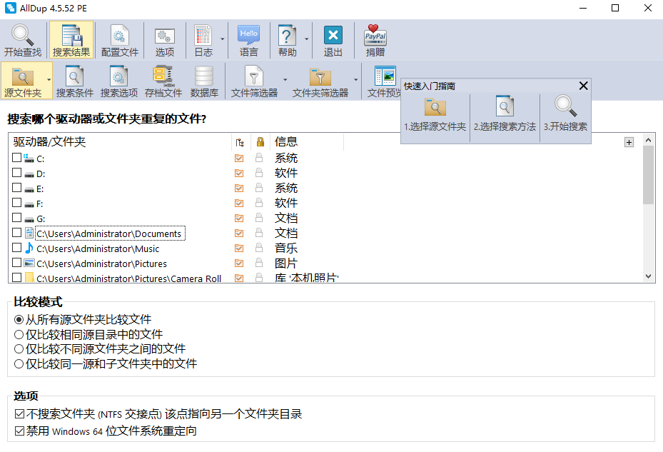 2、优秀的计划能力:AllDup是相当深的计划,和搜索非常灵活。打开“比较法”给你一系列的选择,这是非常有用的。例如,你可能会有重复的MP3文件的不同名称,搜索的大小可能会更成功。
