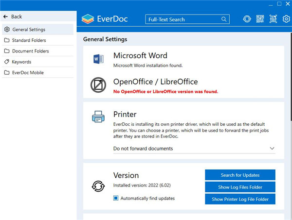 10、可以更改应用程序范围内的EverDoc设置和支持的文本处理程序的状态。