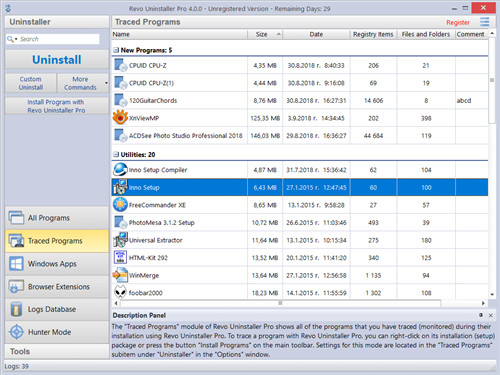 此功能基于Revo Uninstaller Pro自己的实时监控器并派生自此,使其在市场上也独树一帜,日志数据库是我们团队使用上述实时监视功能创建和维护的许多不同程序的大量日志集合,这些日志存储在我们的服务器上,这意味着即使您刚刚安装了,也尚未跟踪任何程序的安装,您都可以在需要时访问它们,您可以轻松地(只需单击一下)卸载程序,或者利用日志数据库中的日志更好地完成卸载,从而删除已经卸载的程序的剩余部分