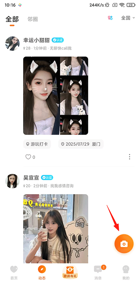 1、打开糖果空间APP,注册登录后在动态页点击右下角的相机按钮;