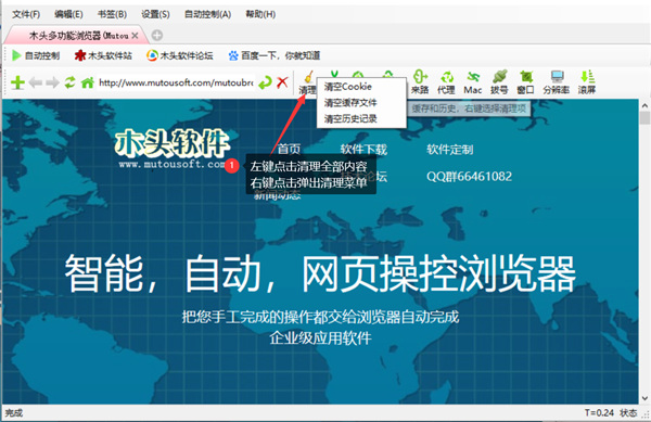 【清理】鼠标左键点击时,删除浏览器缓存、访问历史记录和Cookie;右键点击时弹出快捷菜单,可选择只清理其中一项。