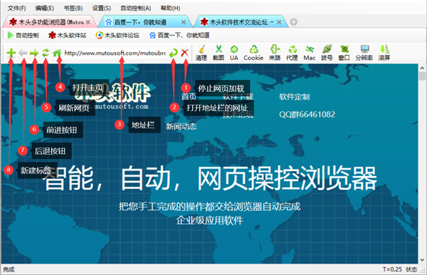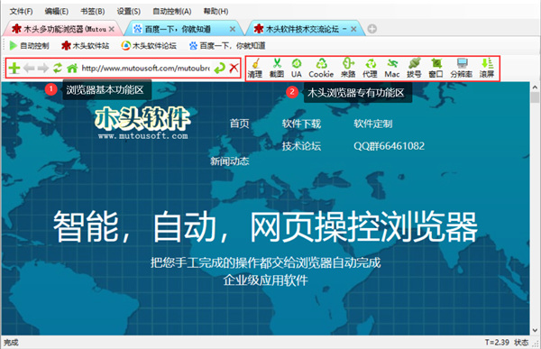 工具栏:显示所有功能按钮,包括浏览器基础功能区域和木头浏览器专有功能区域;