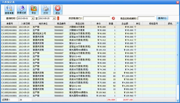 8、在该窗口中显示出某种商品在某时间段所有的进出情况。点击“查找”按钮打开查找窗口,选择相应的条件可以更准备的查询。点击“查看明细”按钮可以打开该记录的详细情况。