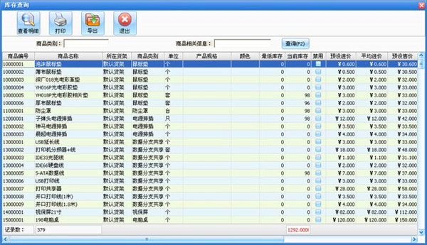 6、在进货管理中点击“当前库存查询”按钮打开库存查询窗口如图。