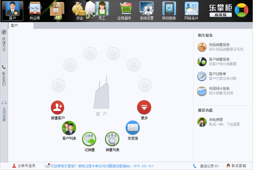 1、提供短信关怀、来电跟踪、网络名片等功能,帮助企业关心客户、获取商机、提升服务质量。2、节流方面围绕客户管理、供应商管理、货品管理、资金管理、员工管理等日常业务,进销存一体化地降低周转成本