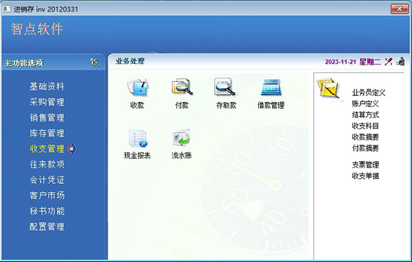 可进行款项相关的收支管理,可管理收款、付款、存取款、借款等内容,并可生成现金报表、流水账等表格