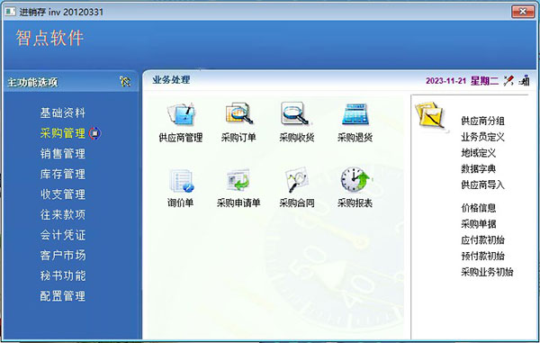 可管理各项采购的基本内容,包括供应商管理、现货采购、采购退货、采购订单、采购合同、采购申请单及采购收货等