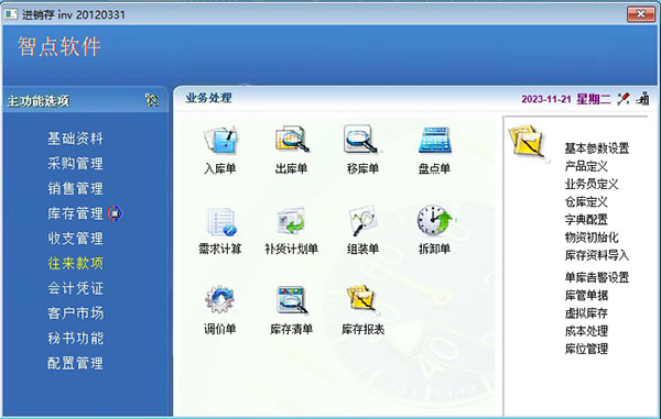 顾名思义就是对仓库的各种产品进行管理,可设置入库、出库、移库等产品信息,并可生成库存清单、库存报表、补货计划单和组装单等详细表格