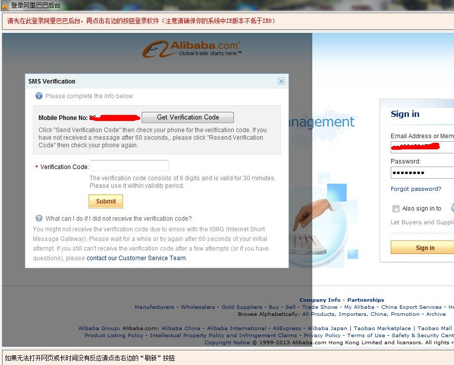 四、如果出现上图所示的状况,说明你的帐号可能存在风险,比如异地登录等阿里巴巴认为不安全的振作,如果你确定安全的话点击发布验证码到手机,闰输入收到的短信中显示的验证码,完成登录。