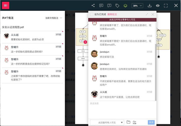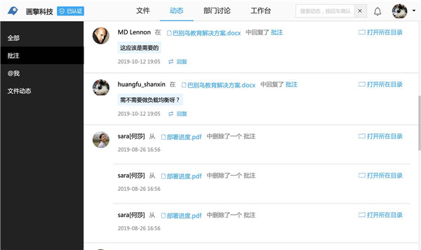 你可以和团队成员一起在巴别鸟上开展讨论。在文档上直接建立“批注”针对具体细节深入探讨,并可以统一管理,快速定位到讨论的内容上,让讨论围绕主题不失焦。