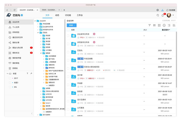 文档是巴别鸟管理的基本单元,也是团队协作、知识共享和创意沟通的核心。所有的工作文档都可以分门别类地放在巴别鸟上。巴别鸟将提供给你一个井然有序的工作环境,你可以便捷地查找和分发工作所需文档,也可以快速查阅特殊格式文档,还能和团队成员基于文档内容自由地讨论。