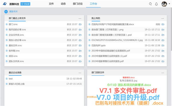 巴别鸟是面向企业推出的文档管理系统,企业工作文件保存在巴别鸟上,配合在线打开文档、同步端及其创新的讨论系统,企业成员可以在同一个文件上进行工作,并在任何设备上沟通和获取工作内容。能大幅提升工作效率并有效管理。针对不同行业的需求,巴别鸟也能提供不同的解决方案,帮助企业