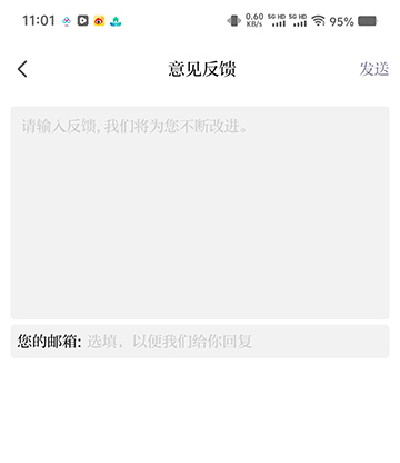 如果用户有意见反馈的需求,操作很简单:打开App进入“我”的界面,找到“意见反馈”选项,填写内容和邮箱后发送即可。这种直接的反馈渠道让用户能更方便地表达自己的意见和建议。