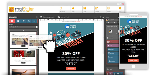 建立你的横幅和广告直接与MailStyler ! 多亏了新的文本图形效果可以应用预设风格和设计为您创建高级图形专家。 释放你的想象力和组装图片和文本在几秒钟内就像一个真正的职业。