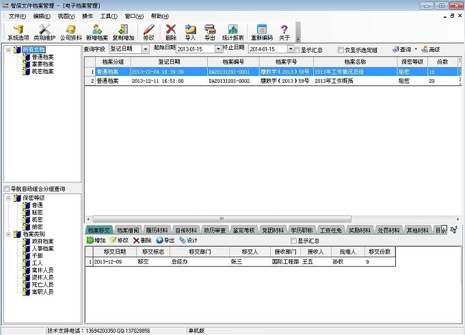 3、档案管理文档基础信息录入:录入文档的详细信息,包括文档分组、文档编号、文档名称、文档类别、文档保密等级、文档存放位置、登记日期、登记人等信息,可自定义增加项目。档案移交:记录档案的部门或者文档负责人直接的档案移交记录,可以记录档案的移交日期,移交标志、移交部门、移交人、接收部门、接收人、批准人及移交份数等情况。也可以自定义编辑档案需要记录的项目。档案借阅:档案借阅是对每次的文档借还进行记录,确保档案有借有还。可以记录档案借出与归还日期、借出标志、借用部门、借阅人等情况。履历材料:可以把与文档相关的材料文件上传,包括扫描件、WORD文档、EXCEL表格、PDF文件等。自传材料、政历审查、鉴定考核、党团材料、学历职称、工资任免、奖励材料、处罚材料、其他材料、目录、档案管理等跟履历材料功能一样,可以对文档的各个层面信息添加扫描件、WORD文档、EXCEL表格、PDF等文件,方便查阅。并且可以您还可以把这些名称显示为您想要的名称,例如把【履历材料】修改为您想要的【xx材料】,都是可行的。