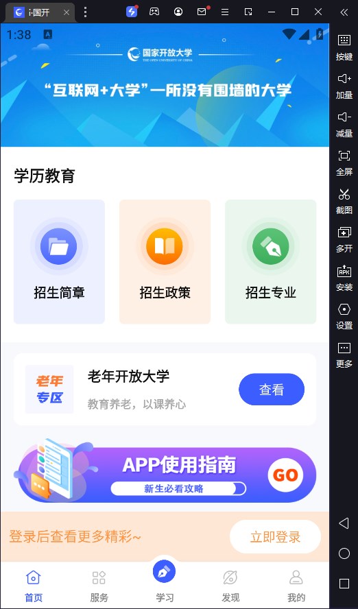 i国开电脑版是借助安卓模拟器运行在pc端的一款学习教育工具。为了给大家提供更好的学习支持服务和学习体验,“i国开”全新上线,要求所有开放教育学生下载、注册,进行学习。让学习伴随你的一年四季,让精彩的课程内容充实着你的每一天,让你的学习在线天数和学习行为次数持续累加,让你成为“学霸”男神和女神!i国开是你专属的“互联网+大学”、你的移动课堂,更是你今后大学生活的“最佳伴侣”!