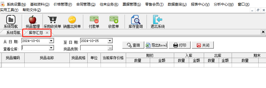 在库存汇总表中记录显示各种业务类型的出、入库数据。