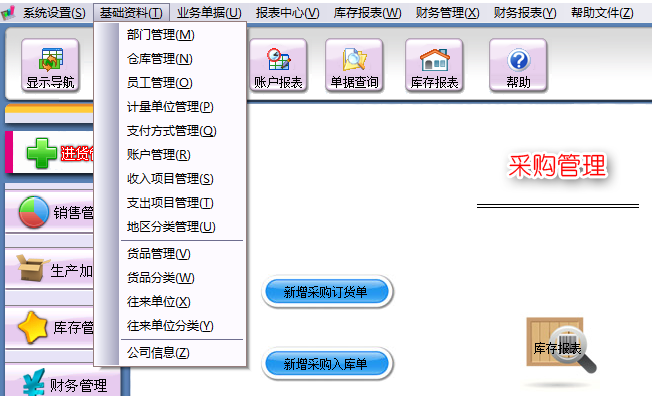 在基础资料中可以对部门、仓库、员工、计量单位、支付方式、帐户、收入、支出、地区、货品分类、往来单位、公司信息进行设置。