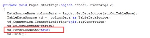 5、这时我们在获取数据表,并自定义绑定数据连接和过滤条件后,进行初始化之前就需要设置表格的ForceLoadData属性为true