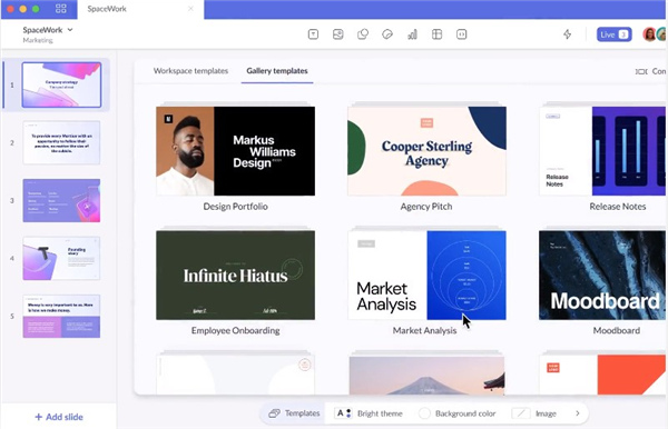 1、在不牺牲创造力的情况下提高生产力Pitch为您提供了释放您内在设计师的所有工具,您可以设置品牌模板,也可以利用我们的模板库尽情发挥想象力,一旦您开始编辑,创新功能将帮助您节省时间。