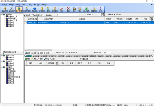 财易工程合同管理软件主要功能:合同评审,合同借阅,资质治理, 制订合同收付款 方案,合同收付款状况,合同执行,合同附件治理,合同扫描件治理,合同 揭示,合同结算,合同罚款,合同备注,往来单位治理,商品 材料治理,根本材料及系统设置等 。