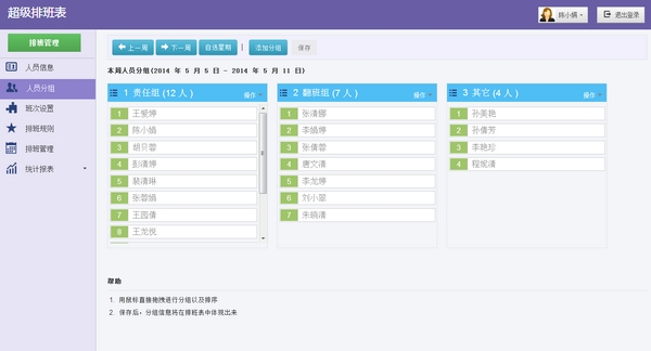 2、编辑人员分组:进入“人员分组”页面,点击“添加”按钮来增加新的分组,并把相应的人员直接拖拽进来,分组信息将直接体现在排班表中