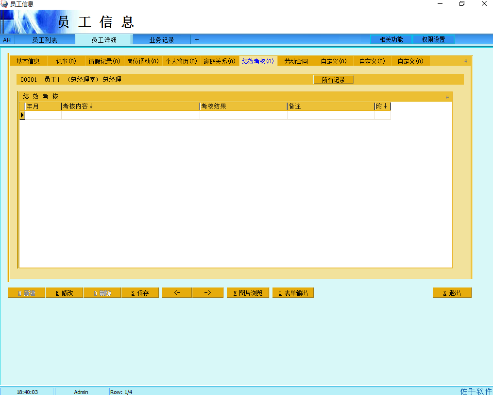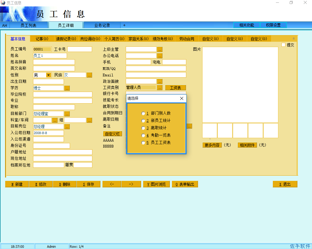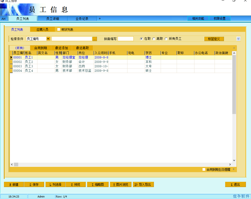 1、员工信息是人事管理模块的主程序,保存了所有在职离职员工的各种人事资料,可以通用权限设置来设定哪些用户可以查看和修改这些数据,权限设置里分基本信息和人事信息,如果没有人事信息查看权的话,则只能查看详细页面里的第一个页面。注意员工部门的输入是在岗位调动里添加一条新的调动记录,填入部门和岗位。