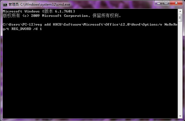 输入reg add HKCU\Software\Microsoft\Office\12.0\Word\Options/v NoReReg/t REG_DWORD /d 1,然后运行;