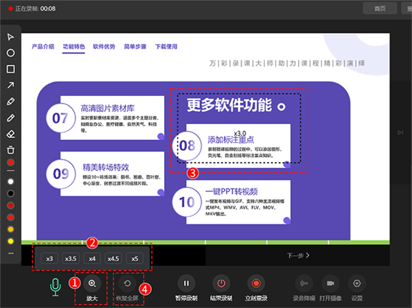 在录制过程中可放大展示局部区域,支持3倍、3.5倍、4倍、4.5倍和5倍放大,不需要时可随时退出放大恢复全屏。