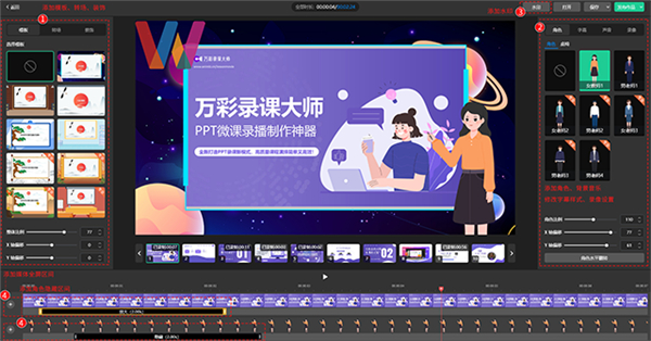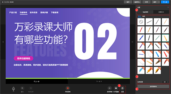 1、录制课程视频:万彩录课大师提供了强大的录制功能,可以帮助用户轻松录制高质量的课程视频。用户可以选择录制整个屏幕、特定窗口或者自定义区域,同时还可以选择录制系统声音和麦克风声音。