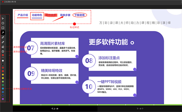 在录制过程中,可以对PPT页面进行标记并可随时修改删除标记,标记的类型分为圆形、矩形、箭头、荧光笔和自由划线,标记可随时清除。