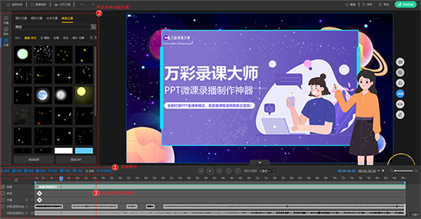 2、深度定制:可对视频进行更深度精细的编辑如添加多种动画元素、特效、前景、背景,设置元素属性等,打造更高级炫酷的微课视频。