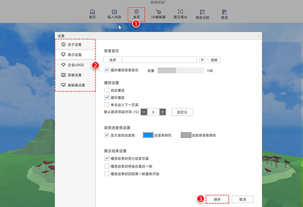 在自定义选项中,可设置3D演示的背景音乐、标志Logo、播放条展示等,支持自定义图像设置和编辑器设置。