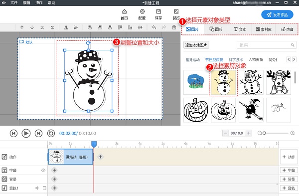 1、添加素材(图片、文字、SWF、视频和音频)。