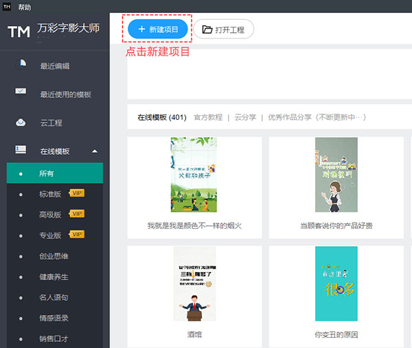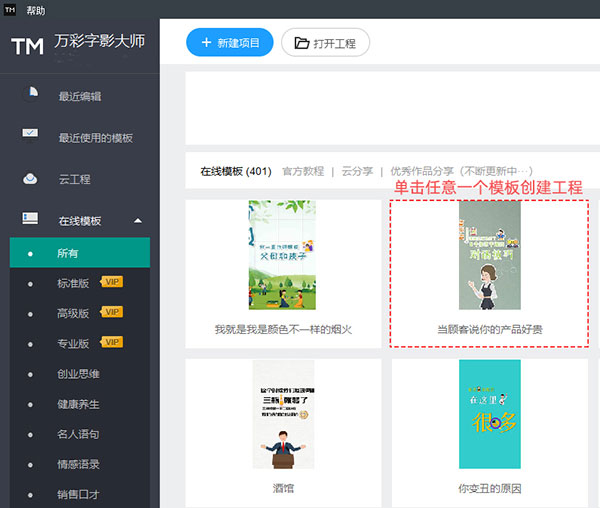 在万彩字影大师的初始界面单击任意一个模板,加载成功进入编辑器后即可在模板的基础上构建工程。如下图所示: