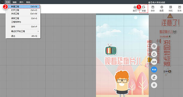 点击工具栏上的【新建】按钮,或者点击编辑器左上角的【文件】-【新建工程】,即可创建新的工程项目。如下图所示: