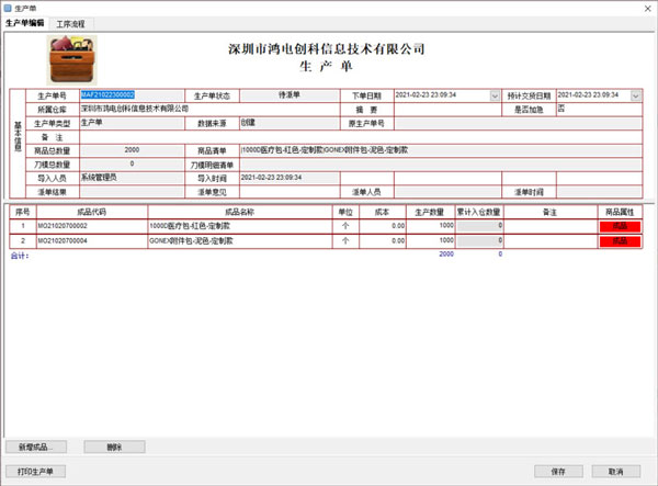 4、创建生产单,填写生产单主表信息后,新增成品,增加生产单明细,最后保存。保存成功后,弹出待派单消息提醒。生产单创建完毕后,进入派单环节,派单到仓库中,进入正式生产,此时工人就可以在手机上填写自己每天的生产工序数量