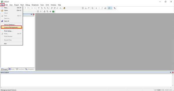 7、双击打开桌面自动生成的“Keil uVision5”快捷方式,点击“File”,选择“License Management”,进入安装密钥