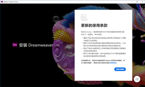 1、在本站下载Adobe Dreamweaver 2023安装程序,打开软件开始安装Dreamweaver,点击接受并继续;