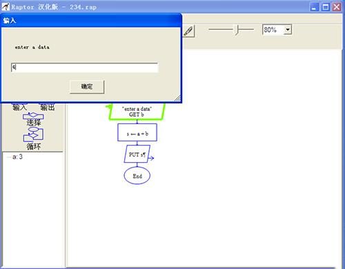 7、在执行过程中,它会用不同的颜色表示执行到了哪一步,这对与在循环或选择结构中确定执行过程非常有帮助,直观明了。这个程序当执行到a的时候,出现一个框,用于输入a的值。执行到b的时候,同样也会弹出一个输入框用于输入b的值。